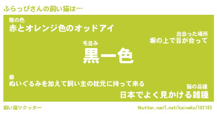 ふらっぴさんの飼い猫は… 毛並み『黒一色』瞳の色『赤とオレンジ色のオッドアイ』猫の品種『日本でよく見かける雑種』 ツクッター #飼い猫ツクッター http://tkutter.nan7.net/kaineko/102183/