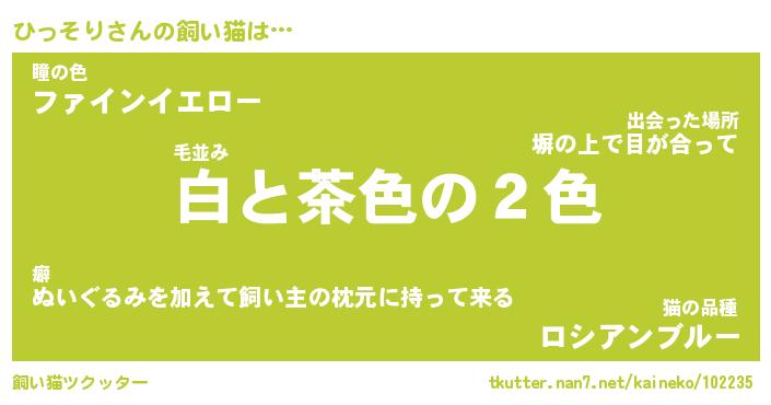 ひっそりさんの飼い猫は… 毛並み『白と茶色の2色』瞳の色『ファインイエロー』猫の品種『ロシアンブルー』 ツクッター #飼い猫ツクッター http://tkutter.nan7.net/kaineko/102235/