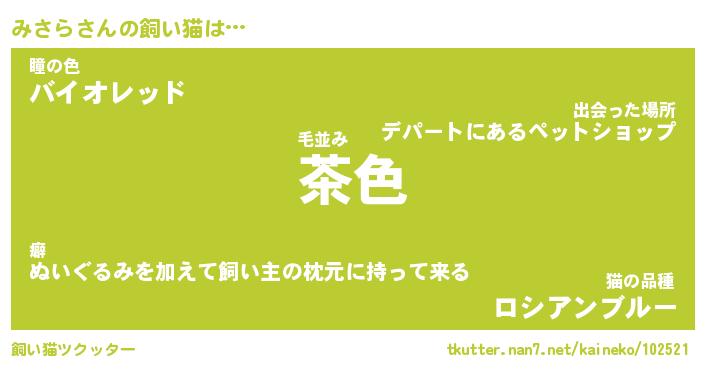 みさらさんの飼い猫は… 毛並み『茶色』瞳の色『バイオレッド』猫の品種『ロシアンブルー』 ツクッター #飼い猫ツクッター http://tkutter.nan7.net/kaineko/102521/