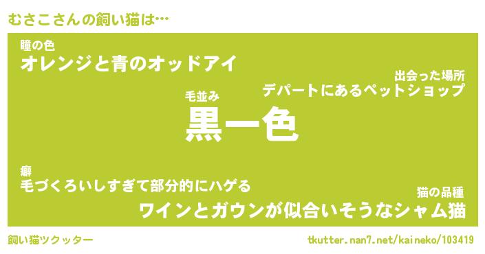 むさこさんの飼い猫は… 毛並み『黒一色』瞳の色『オレンジと青のオッドアイ』猫の品種『ワインとガウンが似合いそうなシャム猫』 ツクッター #飼い猫ツクッター http://tkutter.nan7.net/kaineko/103419/
