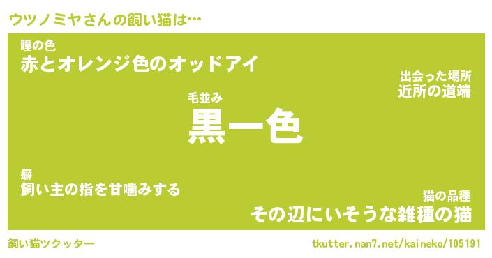 ウツノミヤさんの飼い猫は… 毛並み『黒一色』瞳の色『赤とオレンジ色のオッドアイ』猫の品種『その辺にいそうな雑種の猫』 ツクッター #飼い猫ツクッター http://tkutter.nan7.net/kaineko/105191/