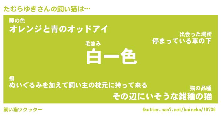 たむらゆきさんの飼い猫は… 毛並み『白一色』瞳の色『オレンジと青のオッドアイ』猫の品種『その辺にいそうな雑種の猫』 ツクッター #飼い猫ツクッター http://tkutter.nan7.net/kaineko/10736/