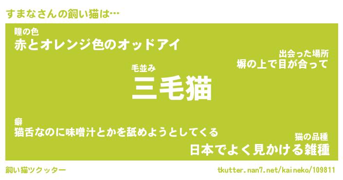 すまなさんの飼い猫は… 毛並み『三毛猫』瞳の色『赤とオレンジ色のオッドアイ』猫の品種『日本でよく見かける雑種』 ツクッター #飼い猫ツクッター http://tkutter.nan7.net/kaineko/109811/