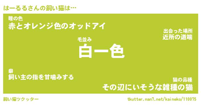 はーるるさんの飼い猫は… 毛並み『白一色』瞳の色『赤とオレンジ色のオッドアイ』猫の品種『その辺にいそうな雑種の猫』 ツクッター #飼い猫ツクッター http://tkutter.nan7.net/kaineko/110075/