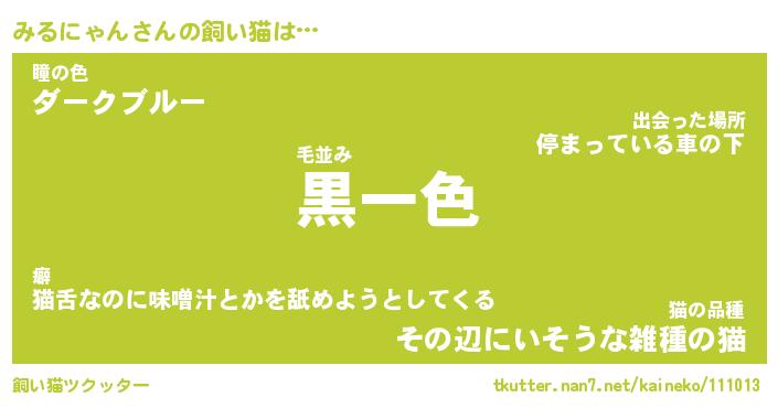 みるにゃんさんの飼い猫は… 毛並み『黒一色』瞳の色『ダークブルー』猫の品種『その辺にいそうな雑種の猫』 ツクッター #飼い猫ツクッター http://tkutter.nan7.net/kaineko/111013/