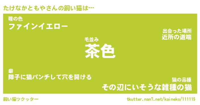 たけなかともやさんの飼い猫は… 毛並み『茶色』瞳の色『ファインイエロー』猫の品種『その辺にいそうな雑種の猫』 ツクッター #飼い猫ツクッター http://tkutter.nan7.net/kaineko/111115/