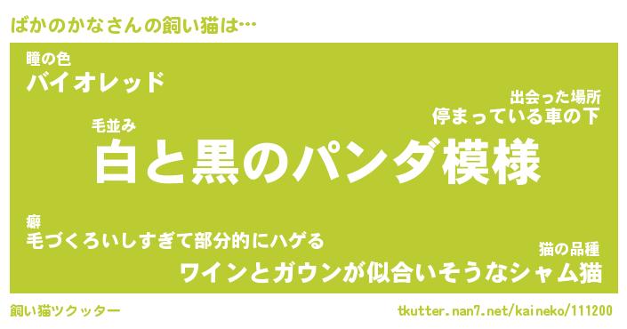 ばかのかなさんの飼い猫は… 毛並み『白と黒のパンダ模様』瞳の色『バイオレッド』猫の品種『ワインとガウンが似合いそうなシャム猫』 ツクッター #飼い猫ツクッター http://tkutter.nan7.net/kaineko/111200/