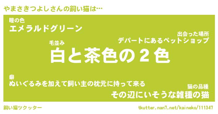 やまさきつよしさんの飼い猫は… 毛並み『白と茶色の2色』瞳の色『エメラルドグリーン』猫の品種『その辺にいそうな雑種の猫』 ツクッター #飼い猫ツクッター http://tkutter.nan7.net/kaineko/111347/