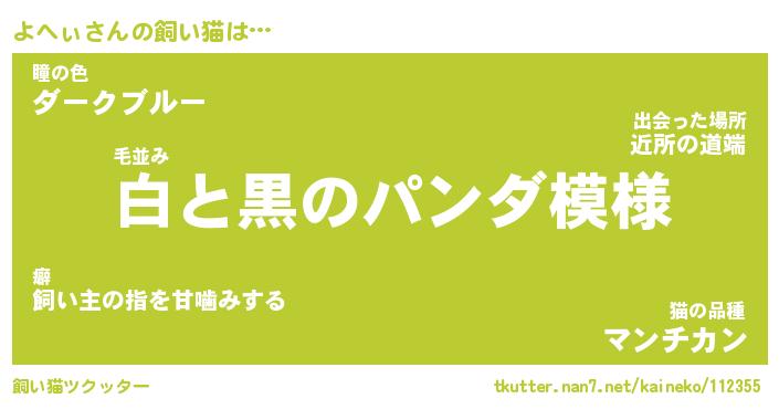 よへぃさんの飼い猫は… 毛並み『白と黒のパンダ模様』瞳の色『ダークブルー』猫の品種『マンチカン』 ツクッター #飼い猫ツクッター http://tkutter.nan7.net/kaineko/112355/