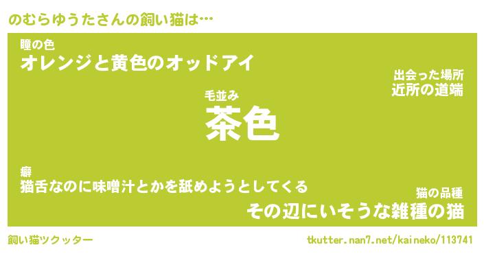 のむらゆうたさんの飼い猫は… 毛並み『茶色』瞳の色『オレンジと黄色のオッドアイ』猫の品種『その辺にいそうな雑種の猫』 ツクッター #飼い猫ツクッター http://tkutter.nan7.net/kaineko/113741/
