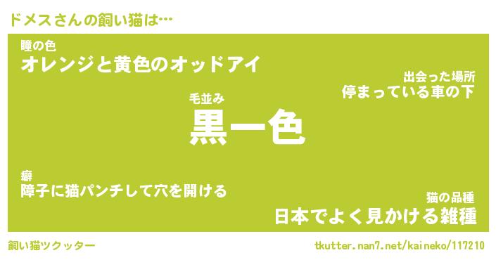 ドメスさんの飼い猫は… 毛並み『黒一色』瞳の色『オレンジと黄色のオッドアイ』猫の品種『日本でよく見かける雑種』 ツクッター #飼い猫ツクッター http://tkutter.nan7.net/kaineko/117210/