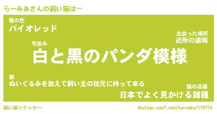 らーみあさんの飼い猫は… 毛並み『白と黒のパンダ模様』瞳の色『バイオレッド』猫の品種『日本でよく見かける雑種』 ツクッター #飼い猫ツクッター http://tkutter.nan7.net/kaineko/118774/