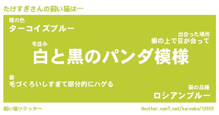 たけすぎさんの飼い猫は… 毛並み『白と黒のパンダ模様』瞳の色『ターコイズブルー』猫の品種『ロシアンブルー』 ツクッター #飼い猫ツクッター http://tkutter.nan7.net/kaineko/12020/
