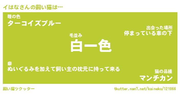 イはなさんの飼い猫は… 毛並み『白一色』瞳の色『ターコイズブルー』猫の品種『マンチカン』 ツクッター #飼い猫ツクッター http://tkutter.nan7.net/kaineko/121066/