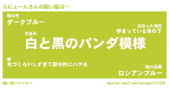 らにょーんさんの飼い猫は… 毛並み『白と黒のパンダ模様』瞳の色『ダークブルー』猫の品種『ロシアンブルー』 ツクッター #飼い猫ツクッター http://tkutter.nan7.net/kaineko/121556/