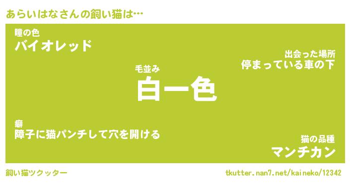 あらいはなさんの飼い猫は… 毛並み『白一色』瞳の色『バイオレッド』猫の品種『マンチカン』 ツクッター #飼い猫ツクッター http://tkutter.nan7.net/kaineko/12342/
