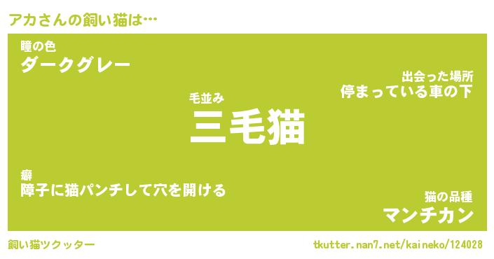 アカさんの飼い猫は… 毛並み『三毛猫』瞳の色『ダークグレー』猫の品種『マンチカン』 ツクッター #飼い猫ツクッター http://tkutter.nan7.net/kaineko/124028/