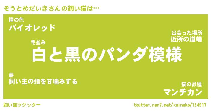 そうとめだいきさんの飼い猫は… 毛並み『白と黒のパンダ模様』瞳の色『バイオレッド』猫の品種『マンチカン』 ツクッター #飼い猫ツクッター http://tkutter.nan7.net/kaineko/124917/