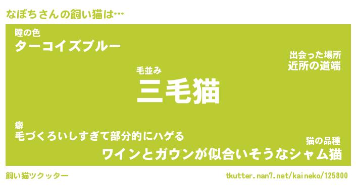 なぼちさんの飼い猫は… 毛並み『三毛猫』瞳の色『ターコイズブルー』猫の品種『ワインとガウンが似合いそうなシャム猫』 ツクッター #飼い猫ツクッター http://tkutter.nan7.net/kaineko/125800/