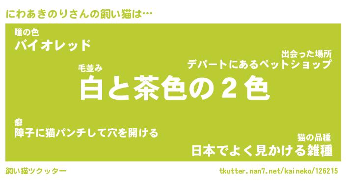 にわあきのりさんの飼い猫は… 毛並み『白と茶色の2色』瞳の色『バイオレッド』猫の品種『日本でよく見かける雑種』 ツクッター #飼い猫ツクッター http://tkutter.nan7.net/kaineko/126215/