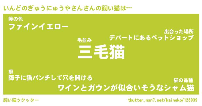 | 猫 | 猫の名前『いんいんにゃん』性別『雌』 |