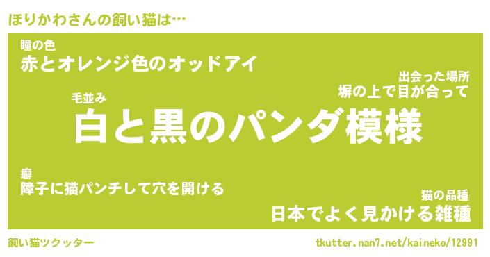 ほりかわさんの飼い猫は… 毛並み『白と黒のパンダ模様』瞳の色『赤とオレンジ色のオッドアイ』猫の品種『日本でよく見かける雑種』 ツクッター #飼い猫ツクッター http://tkutter.nan7.net/kaineko/12991/