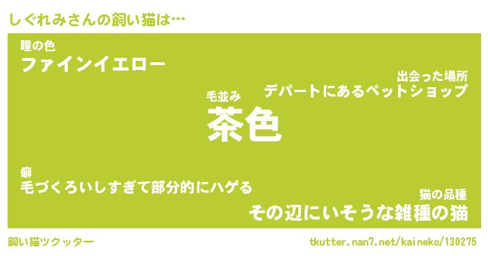 しぐれみさんの飼い猫は… 毛並み『茶色』瞳の色『ファインイエロー』猫の品種『その辺にいそうな雑種の猫』 ツクッター #飼い猫ツクッター http://tkutter.nan7.net/kaineko/130275/