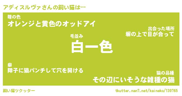 アディスルヴァさんの飼い猫は… 毛並み『白一色』瞳の色『オレンジと黄色のオッドアイ』猫の品種『その辺にいそうな雑種の猫』 ツクッター #飼い猫ツクッター http://tkutter.nan7.net/kaineko/130765/