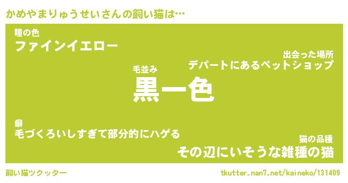 かめやまりゅうせいさんの飼い猫は… 毛並み『黒一色』瞳の色『ファインイエロー』猫の品種『その辺にいそうな雑種の猫』 ツクッター #飼い猫ツクッター http://tkutter.nan7.net/kaineko/131409/