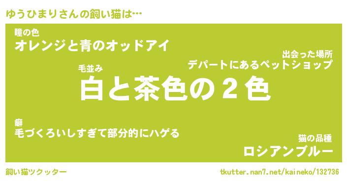 ゆうひまりさんの飼い猫は… 毛並み『白と茶色の2色』瞳の色『オレンジと青のオッドアイ』猫の品種『ロシアンブルー』 ツクッター #飼い猫ツクッター http://tkutter.nan7.net/kaineko/132736/