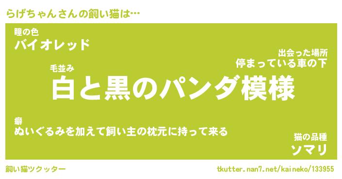 | ツイッター | らげちゃんさんのツイッターID『namakemono_man』 |
