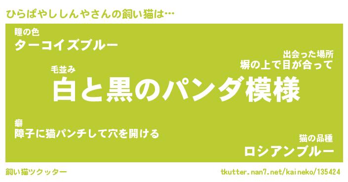 ひらばやししんやさんの飼い猫は… 毛並み『白と黒のパンダ模様』瞳の色『ターコイズブルー』猫の品種『ロシアンブルー』 ツクッター #飼い猫ツクッター http://tkutter.nan7.net/kaineko/135424/