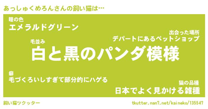 あっしゅくめろんさんの飼い猫は… 毛並み『白と黒のパンダ模様』瞳の色『エメラルドグリーン』猫の品種『日本でよく見かける雑種』 ツクッター #飼い猫ツクッター http://tkutter.nan7.net/kaineko/135547/