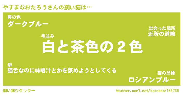 やすまなおたろうさんの飼い猫は… 毛並み『白と茶色の2色』瞳の色『ダークブルー』猫の品種『ロシアンブルー』 ツクッター #飼い猫ツクッター http://tkutter.nan7.net/kaineko/135730/