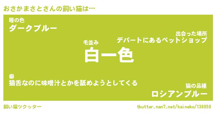 おさかまさとさんの飼い猫は… 毛並み『白一色』瞳の色『ダークブルー』猫の品種『ロシアンブルー』 ツクッター #飼い猫ツクッター http://tkutter.nan7.net/kaineko/136050/
