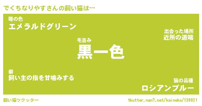 でくちなりやすさんの飼い猫は… 毛並み『黒一色』瞳の色『エメラルドグリーン』猫の品種『ロシアンブルー』 ツクッター #飼い猫ツクッター http://tkutter.nan7.net/kaineko/139921/