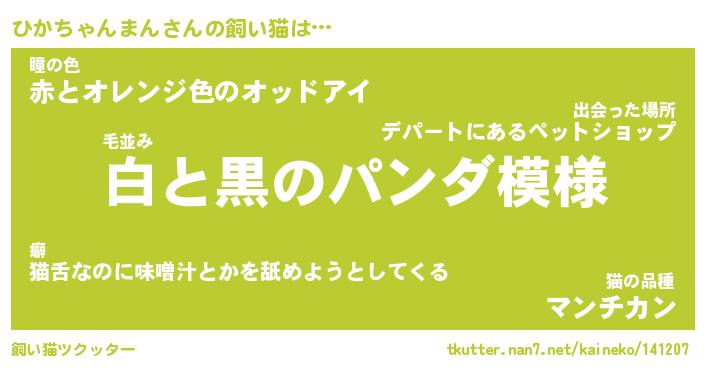 ひかちゃんまんさんの飼い猫は… 毛並み『白と黒のパンダ模様』瞳の色『赤とオレンジ色のオッドアイ』猫の品種『マンチカン』 ツクッター #飼い猫ツクッター http://tkutter.nan7.net/kaineko/141207/