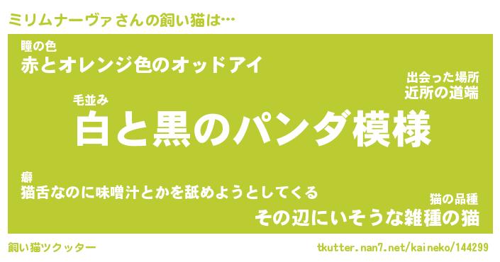 ミリムナーヴァさんの飼い猫は… 毛並み『白と黒のパンダ模様』瞳の色『赤とオレンジ色のオッドアイ』猫の品種『その辺にいそうな雑種の猫』 ツクッター #飼い猫ツクッター http://tkutter.nan7.net/kaineko/144299/