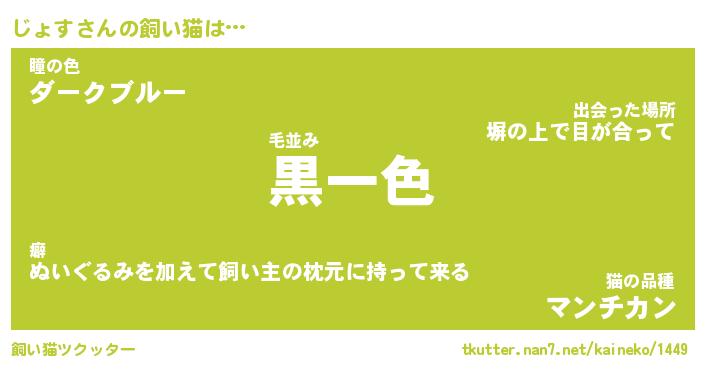 じょすさんの飼い猫は… 毛並み『黒一色』瞳の色『ダークブルー』猫の品種『マンチカン』 ツクッター #飼い猫ツクッター http://tkutter.nan7.net/kaineko/1449/