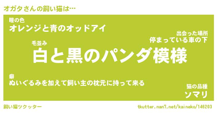 オガタさんの飼い猫は… 毛並み『白と黒のパンダ模様』瞳の色『オレンジと青のオッドアイ』猫の品種『ソマリ』 ツクッター #飼い猫ツクッター http://tkutter.nan7.net/kaineko/146203/