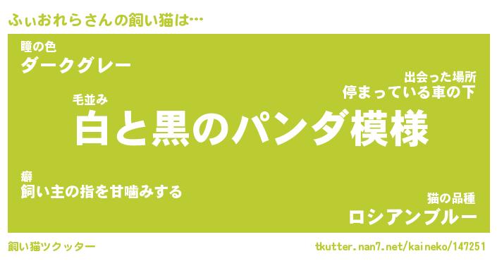 ふぃおれらさんの飼い猫は… 毛並み『白と黒のパンダ模様』瞳の色『ダークグレー』猫の品種『ロシアンブルー』 ツクッター #飼い猫ツクッター http://tkutter.nan7.net/kaineko/147251/