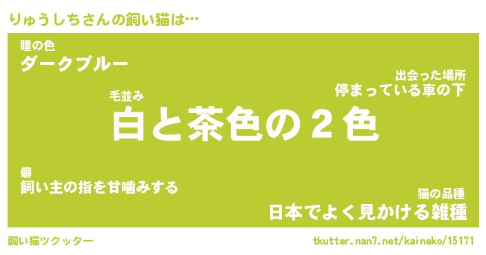 りゅうしちさんの飼い猫は… 毛並み『白と茶色の2色』瞳の色『ダークブルー』猫の品種『日本でよく見かける雑種』 ツクッター #飼い猫ツクッター http://tkutter.nan7.net/kaineko/15171/