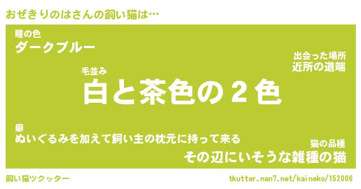 おぜきりのはさんの飼い猫は… 毛並み『白と茶色の2色』瞳の色『ダークブルー』猫の品種『その辺にいそうな雑種の猫』 ツクッター #飼い猫ツクッター http://tkutter.nan7.net/kaineko/152006/