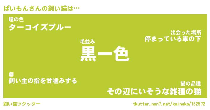 ぱいもんさんの飼い猫は… 毛並み『黒一色』瞳の色『ターコイズブルー』猫の品種『その辺にいそうな雑種の猫』 ツクッター #飼い猫ツクッター http://tkutter.nan7.net/kaineko/152572/