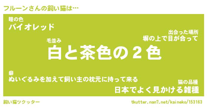 フルーンさんの飼い猫は… 毛並み『白と茶色の2色』瞳の色『バイオレッド』猫の品種『日本でよく見かける雑種』 ツクッター #飼い猫ツクッター http://tkutter.nan7.net/kaineko/153163/