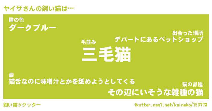 ヤイサさんの飼い猫は… 毛並み『三毛猫』瞳の色『ダークブルー』猫の品種『その辺にいそうな雑種の猫』 ツクッター #飼い猫ツクッター http://tkutter.nan7.net/kaineko/153773/