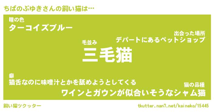 ちばのぶゆきさんの飼い猫は… 毛並み『三毛猫』瞳の色『ターコイズブルー』猫の品種『ワインとガウンが似合いそうなシャム猫』 ツクッター #飼い猫ツクッター http://tkutter.nan7.net/kaineko/15445/