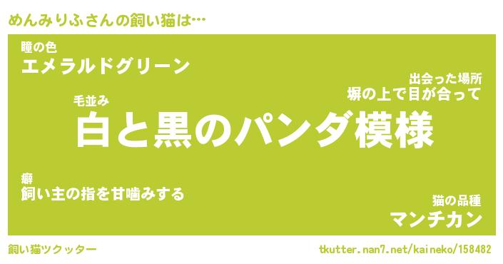 | 猫 | 猫の名前『めんめんにゃん』性別『メス』 |