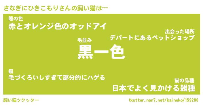 さなぎにひきこもりさんの飼い猫は… 毛並み『黒一色』瞳の色『赤とオレンジ色のオッドアイ』猫の品種『日本でよく見かける雑種』 ツクッター #飼い猫ツクッター http://tkutter.nan7.net/kaineko/159280/