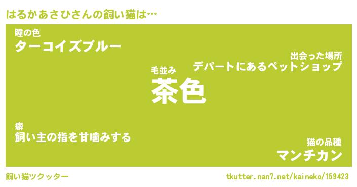 はるかあさひさんの飼い猫は… 毛並み『茶色』瞳の色『ターコイズブルー』猫の品種『マンチカン』 ツクッター #飼い猫ツクッター http://tkutter.nan7.net/kaineko/159423/